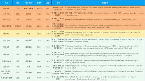 在胸腺上皮肿瘤、头颈鳞癌、肉瘤、前列腺癌、甲状腺癌等其他多个疾病领域,卡瑞利珠单抗、阿帕替尼、瑞维鲁胺、阿得贝利单抗、法米替尼、HRS-7058、HRS-4642、HRS-5041等抗肿瘤创新药相关研究一共入选了4项口头报告、1项简短口头报告、5项壁报,彰显了918博天堂医药强大的研发实力。此外,海曲泊帕和昂丹司琼口溶膜分别在防治化疗导致的血小板减少和恶心呕吐方面各有1项研究入选壁报。